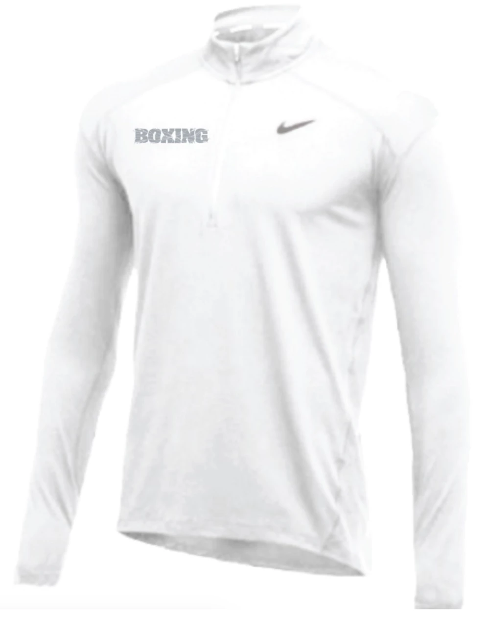 Nike Men’s Boxing 1/2 Zip Top – White – Nike Dri-FIT technology helps you stay dry and comfortable. 1/2-zip design with a mock neck provides versatile coverage. Interior tape moves smoothly against your skin. Swoosh design trademark is printed on the right chest. 100% POLYESTER.