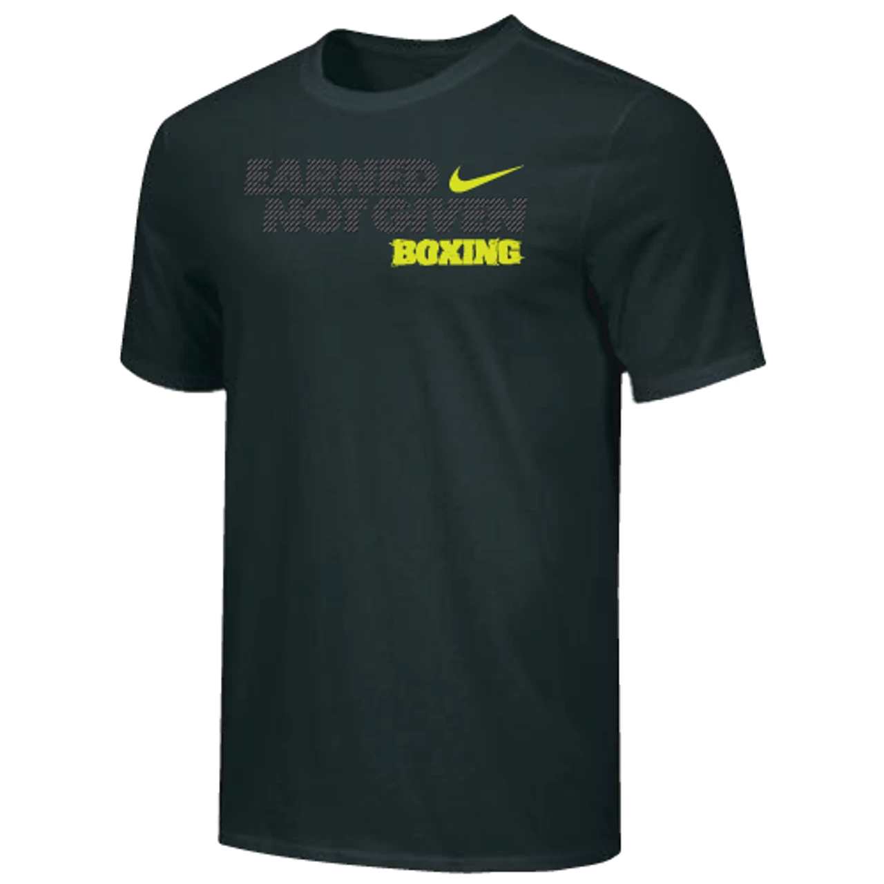 Nike Men’s Boxing Earned Not Given Tee – Black/Grey/Yellow – Form and function combine for a modernized look with less bulk in the Nike 100% Premium Ring Spun Cotton Tee.