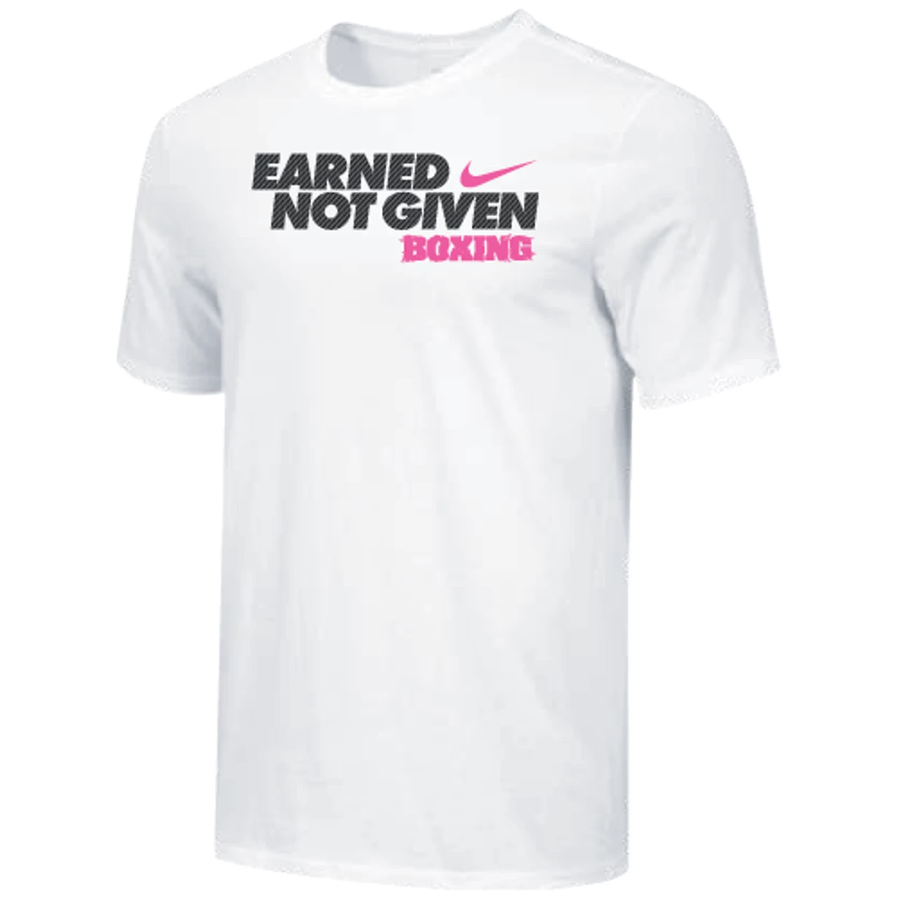 Nike Men’s Boxing Earned Not Given Tee – White/Black/Pink – Form and function combine for a modernized look with less bulk in the Nike 100% Premium Ring Spun Cotton Tee.