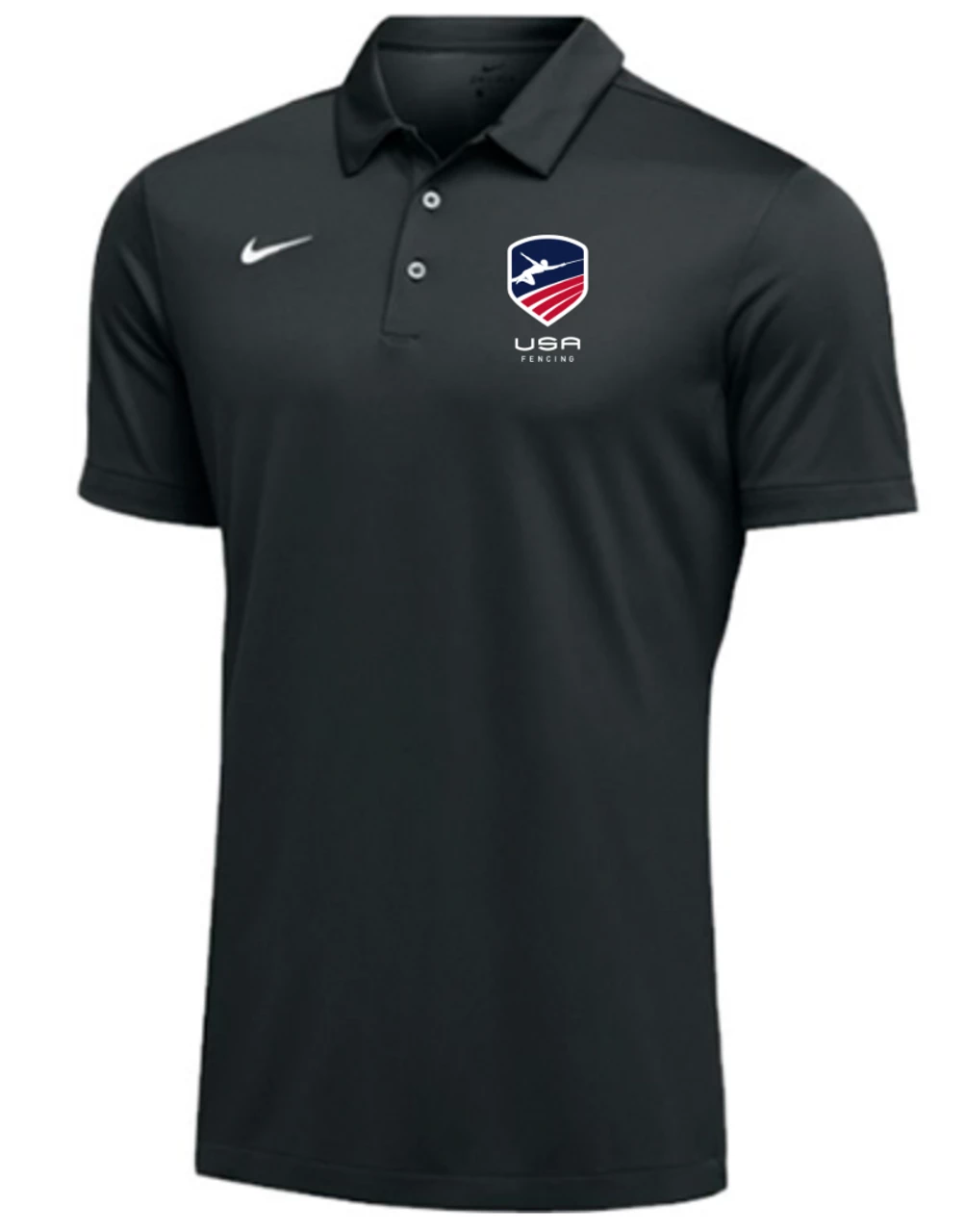 Nike Men’s USAF SS Polo – Black – USA Fencing short sleeve polo has a Dri-FIT double knit flat back mesh body fabric with self collar. 3 Button front placket. Embroidered Swoosh design trademark at right chest. ** Please allow 10 business days from order date for production** **THIS ITEM IS NOT AVAILABLE FOR EXPRESS SHIPPING**
