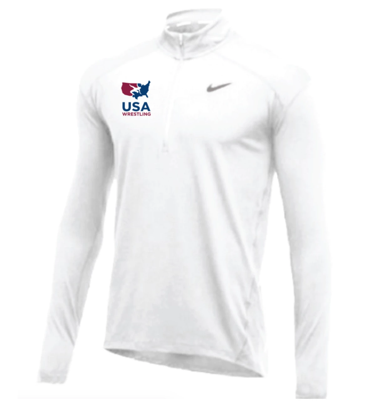 Nike Men’s USA Wrestling 1/2 Zip Top – White – Nike Dri-FIT technology helps you stay dry and comfortable. 1/2-zip design with a mock neck provides versatile coverage. Interior tape moves smoothly against your skin. Swoosh design trademark is printed on the right chest. 100% POLYESTER.