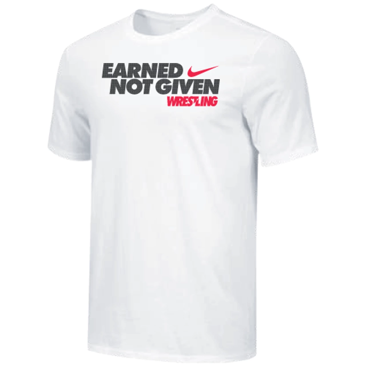 Nike Men’s Wrestling Earned Not Given Tee – White/Black/Red – Form and function combine for a modernized look with less bulk in the Nike 100% Premium Ring Spun Cotton Tee.