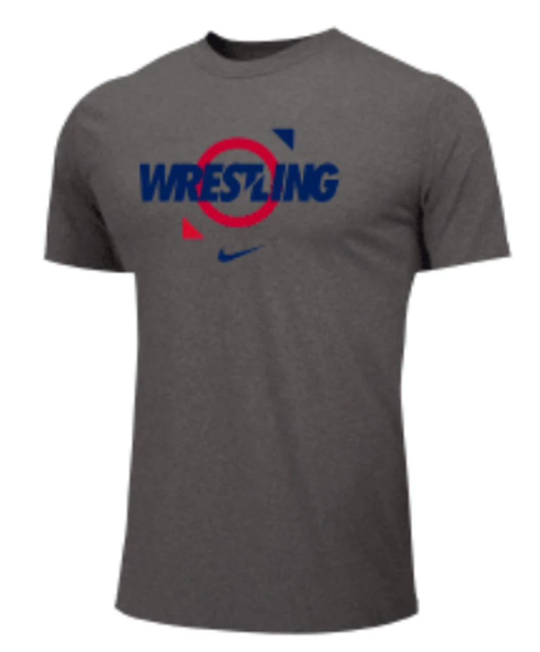 Nike Men’s Wrestling Tee – Grey/Red/Blue – Form and function combine for a modernized look with less bulk in the Nike 100% Premium Ring Spun Cotton Tee. **Â Please allow 10 business days from order date for production** **THIS ITEM IS NOT AVAILABLE FOR EXPRESS SHIPPING**