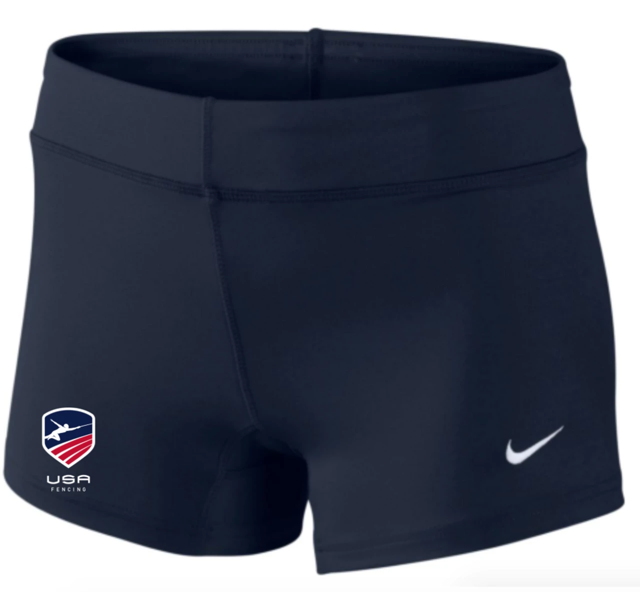 Nike Women’s USA Fencing Performance Game Short – Nike Women’s USA Fencing Performance Game Short are a performance Dri-FIT fabric short with elastic waist. Lined crotch gusset and embroidered Nike Swoosh design trademark at the lower left leg. Hip width: 16.75″, Inseam length: 3.75″ (size medium). Fabric: 82% polyester / 18% spandex.